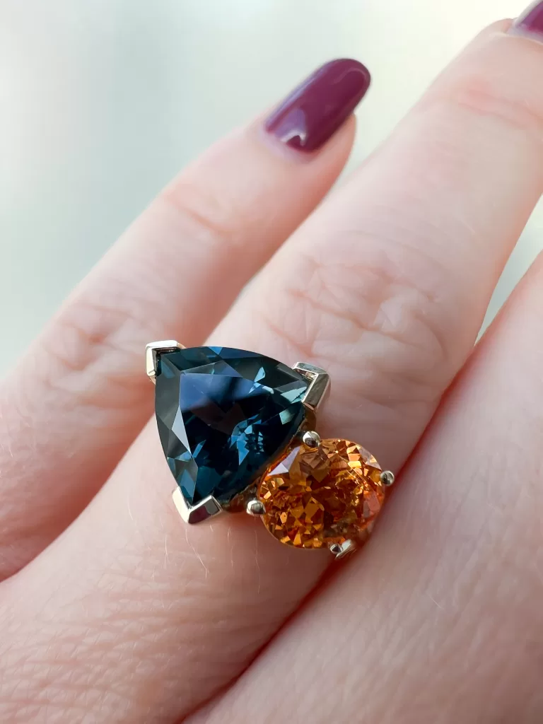 This toi et moi dress ring was self-commissioned as a Christmas gift. Designed to celebrate colour, contrast, and confidence, a razor-sharp trillion-cut London Blue Topaz is paired with a vibrant oval “fanta” garnet, creating a striking composition full of energy and personality.