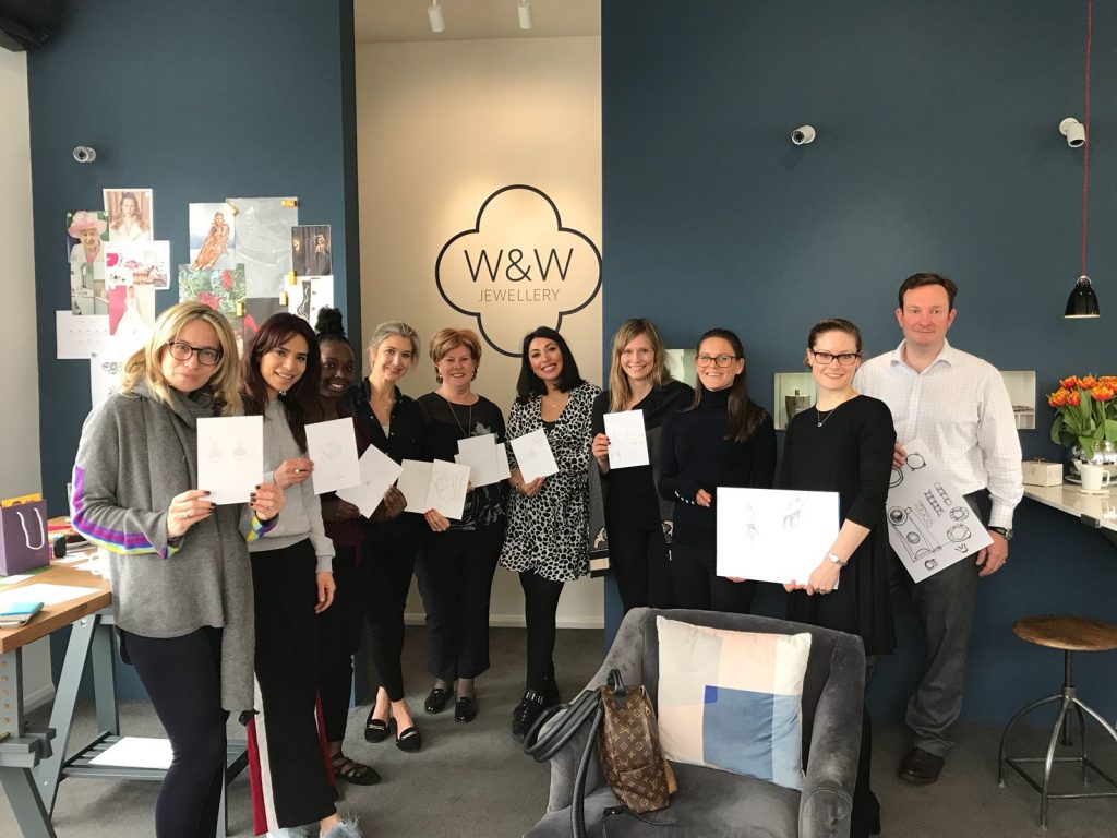 Armed with pencils and stencils, a creative team of local Mums and Mum Bloggers sketched the jewellery of their dreams, using an array of gemstones and jewels as inspiration. We also showcased a number of our own designs on Beuzeval Furniture’s beautiful bespoke frame – to help aid the creative process too. From roses and snowflakes to a Hepworth inspired sculptural ring, we were really impressed with the standard of imaginative jewellery designs.
