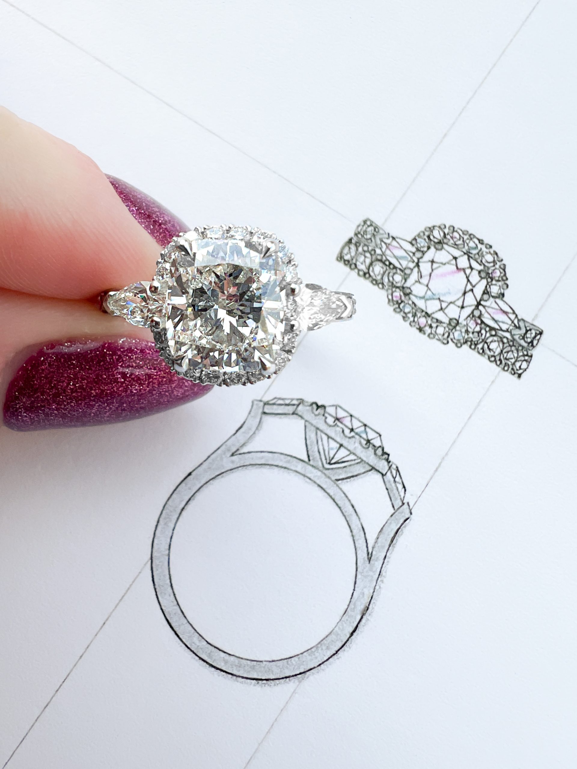 Platinum Cushion Cut Bespoke Halo Ring » J5091 – Ring & Sketch