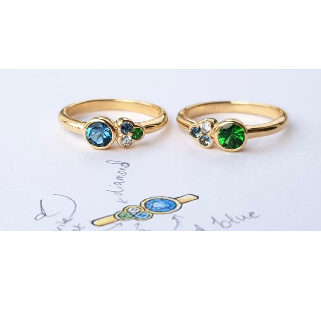 This pretty pairing was created as a treat for our client’s two daughters. Featuring each girl’s birthstone – a London blue topaz for November and a green tsavorite garnet for January – the rings also include gemstones to represent the rest of the family – aquamarine for Mummy and a diamond for Daddy.
